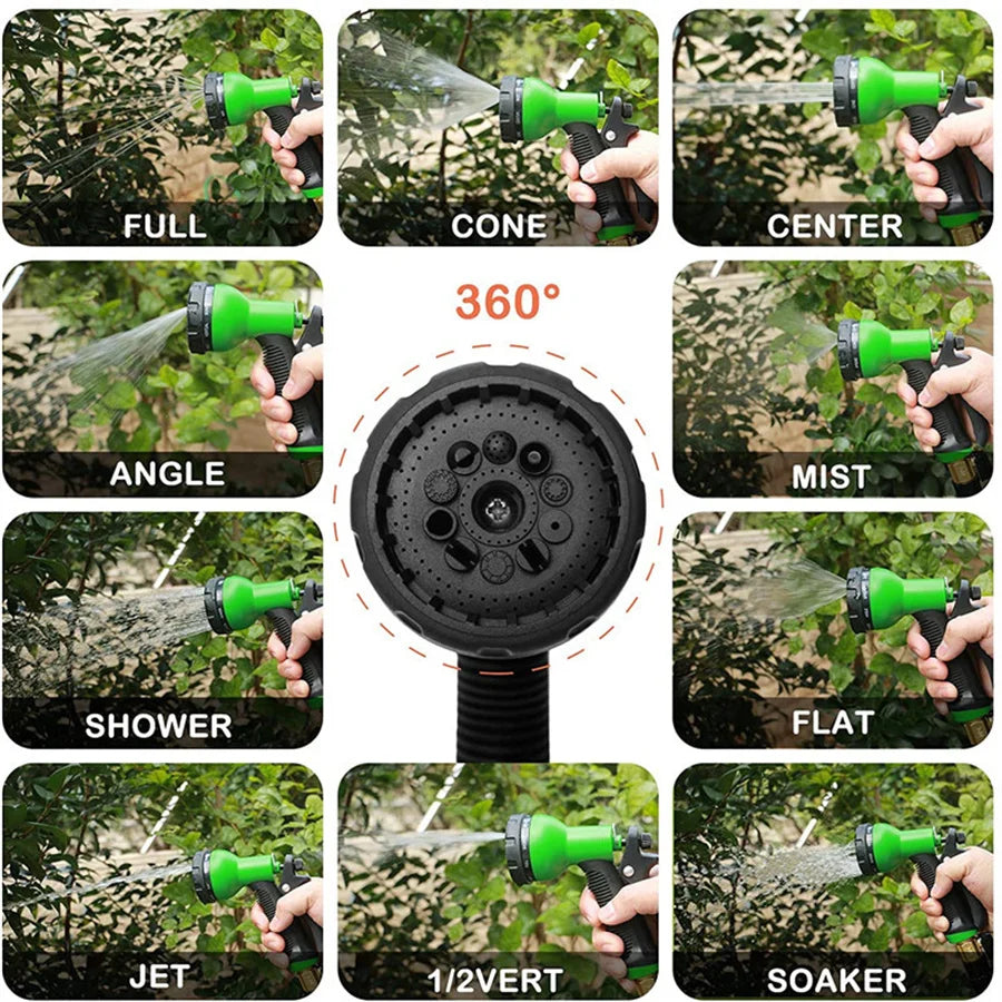 The expandable garden hose nozzle provides 8-function water spray mode, and the rubber handle is easy to grasp and anti-slip. The extended garden hose has many uses, such as car cleaning, gardening, yard cleaning, pet bathing, etc.